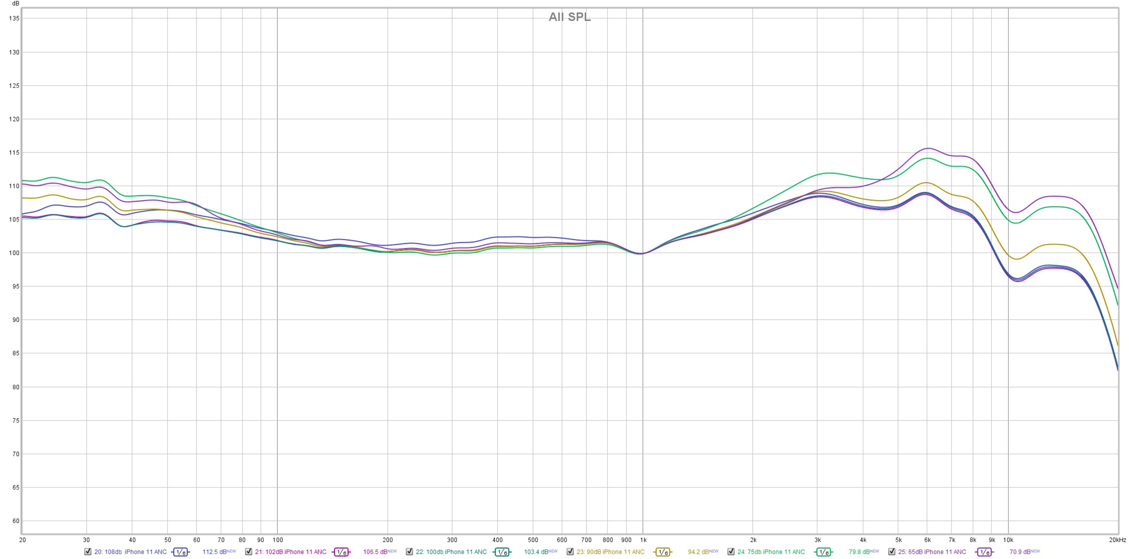 When connected to an iOS device, these headphones can adjust their bass and treble amounts automatically to help mitigate the effects of the Fletcher-Munson curve, which shows that listeners perceive quieter audio to have less bass and treble. These headphones counter this phenomenon by increasing bass and treble at lower volumes to encourage people to listen at lower levels. You can see the change in frequency response when using an iOS device with ANC on and ANC off. This effect doesn't apply to PCs or Android devices. It's also worth noting that the frequency response changes slightly depending on whether you turn the ANC on/off.