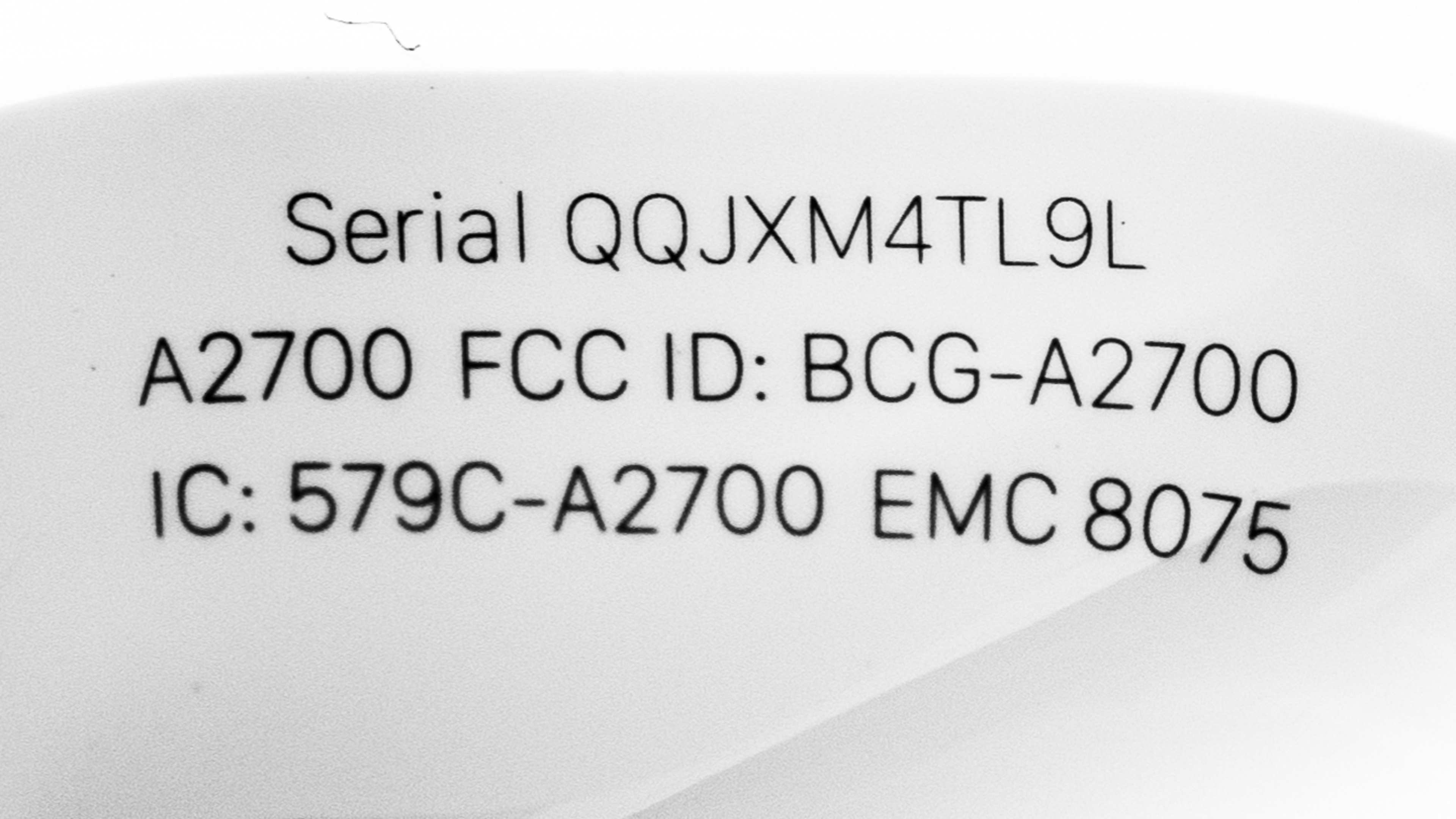 The Apple AirPods Pro 2 come in 'White', and you can see our model's label here. You can also purchase this model with a carrying case that either has a Lightning or USB-C port. While we tested the model with the Lightning case, the USB-C variant includes a cable to charge the case. It also supports MagSafe charging, which is handy if you want to go completely wireless. The buds themselves have an updated rating of IP54 for dust and water resistance, which is a slight change from the original model's IPX4 rating, which only certifies water resistance.