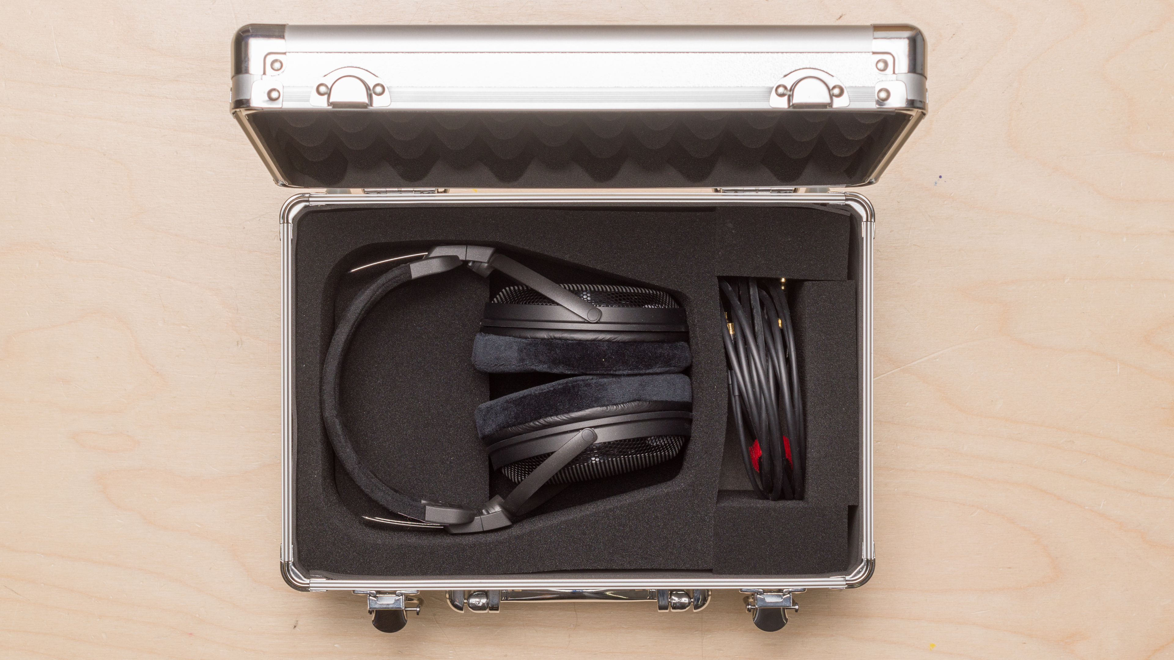 The Audio-Technica ADX3000 come with a massive carrying case that is designed more for protection than convenience. It features foam cutouts that securely hold the headphones and cable in place, preventing damage from drops or falls. Its hard exterior shell locks tightly shut with a clamp closure, making it excellent for transporting your headphones safely, but it's not something you'd want to use every day.