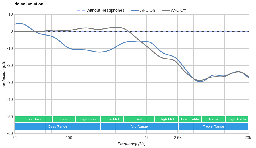 They have poor noise isolation. They perform below average in all categories. The passive isolation provided by the ear cup does a decent job of blocking treble sounds; however, they stop being effective below 800Hz. The active noise cancellation provides around 10dB of reduction from 100Hz-400Hz but doesn't do much below or above that range. The self-noise is rather high too.