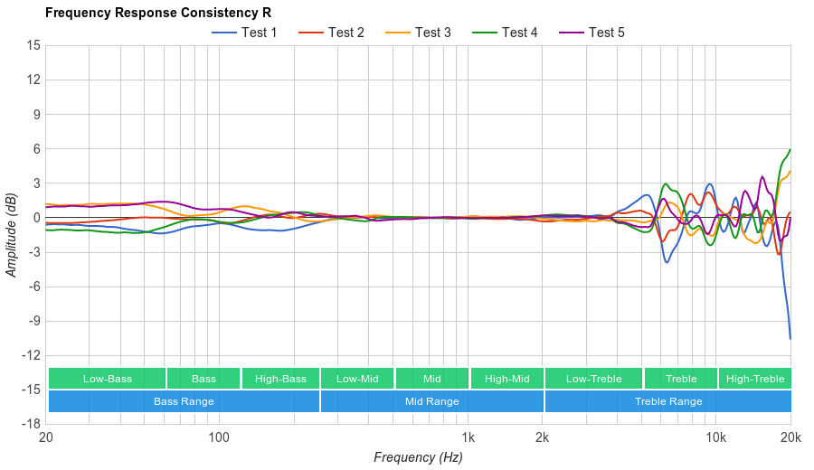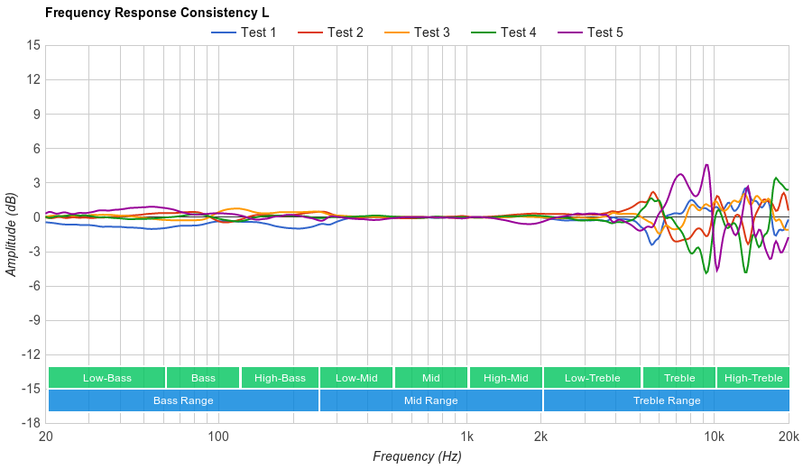 Fit, positioning, and seal contribute to how you perceive frequency responses, and these headphones supply a predictably very good consistency. Pay attention to the over-ear seal to ensure all frequencies remain audibly consistent between wears.