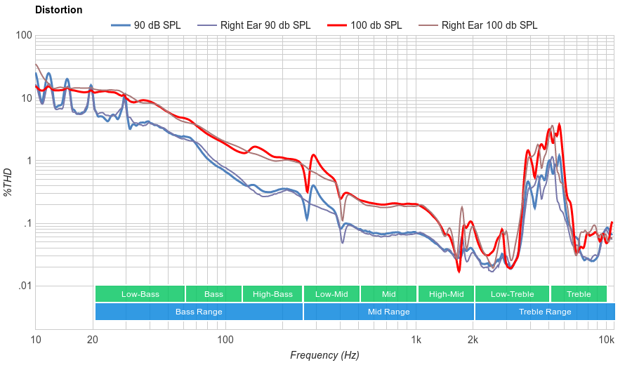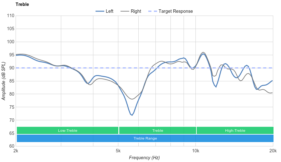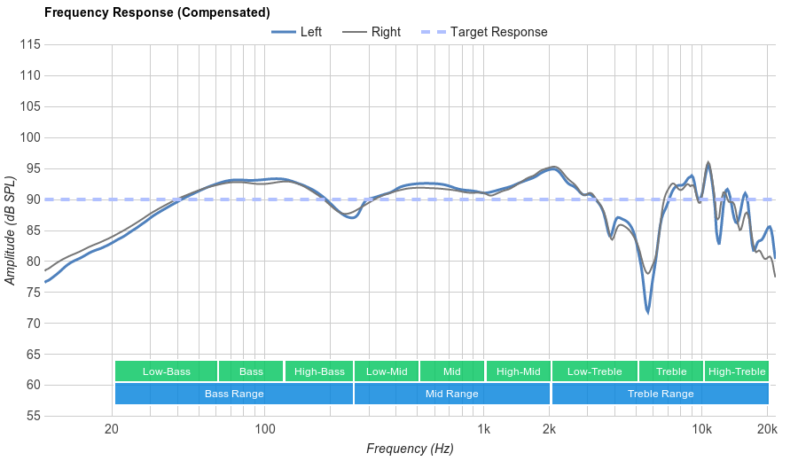 Bass accuracy is great. The overemphasis in the mid-bass and high-bass ensures those frequencies can sound boomy. However, there's a low-bass roll-off below our target curve. As a result, your audio has audible, boomy bass, but it won't sound especially thumpy. For instance, fans of EDM and hip-hop might notice the lowest frequency thump is lacking.