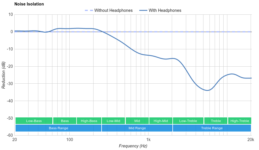 The headphones exhibit overall poor noise isolation. They don't have active noise cancelling, and the passive isolation provided by the ear cups mainly reduces high-pitched environmental noise. They provide virtually no isolation in the bass range, and isolation only starts to kick in at the mids and higher. They block high-pitched noises like a fan whines better than a bus engine.