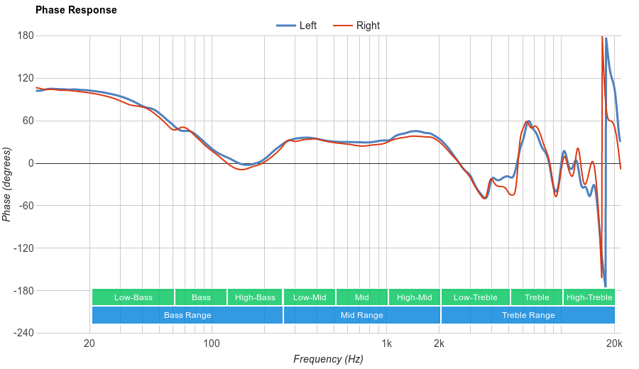 The imaging is excellent. Generally, the Audio-Technica headphones we've tested exhibit consistent imaging results. Quality control appears solid, with similar performance exhibited in each driver, although this still inevitably varies from unit to unit. While the bass frequencies have some group delay, it's minor and doesn't contribute negatively to your listening experience. Our unit's L/R dynamic drivers are also well-matched in phase, amplitude, and frequency response, which ensures that sound objects like footsteps reproduce accurately.