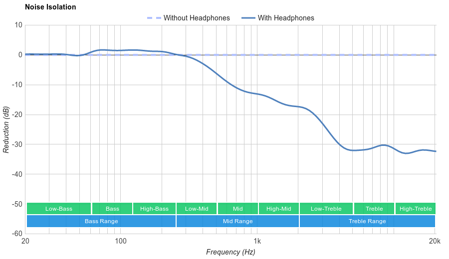 Poor isolation. The passive isolation provided by the ear cups performs well in the treble range. They consistently provide more than 20dB of isolation. However, the overall amount of isolation is only about 10dB in the mid-range and 0dB in the bass range.