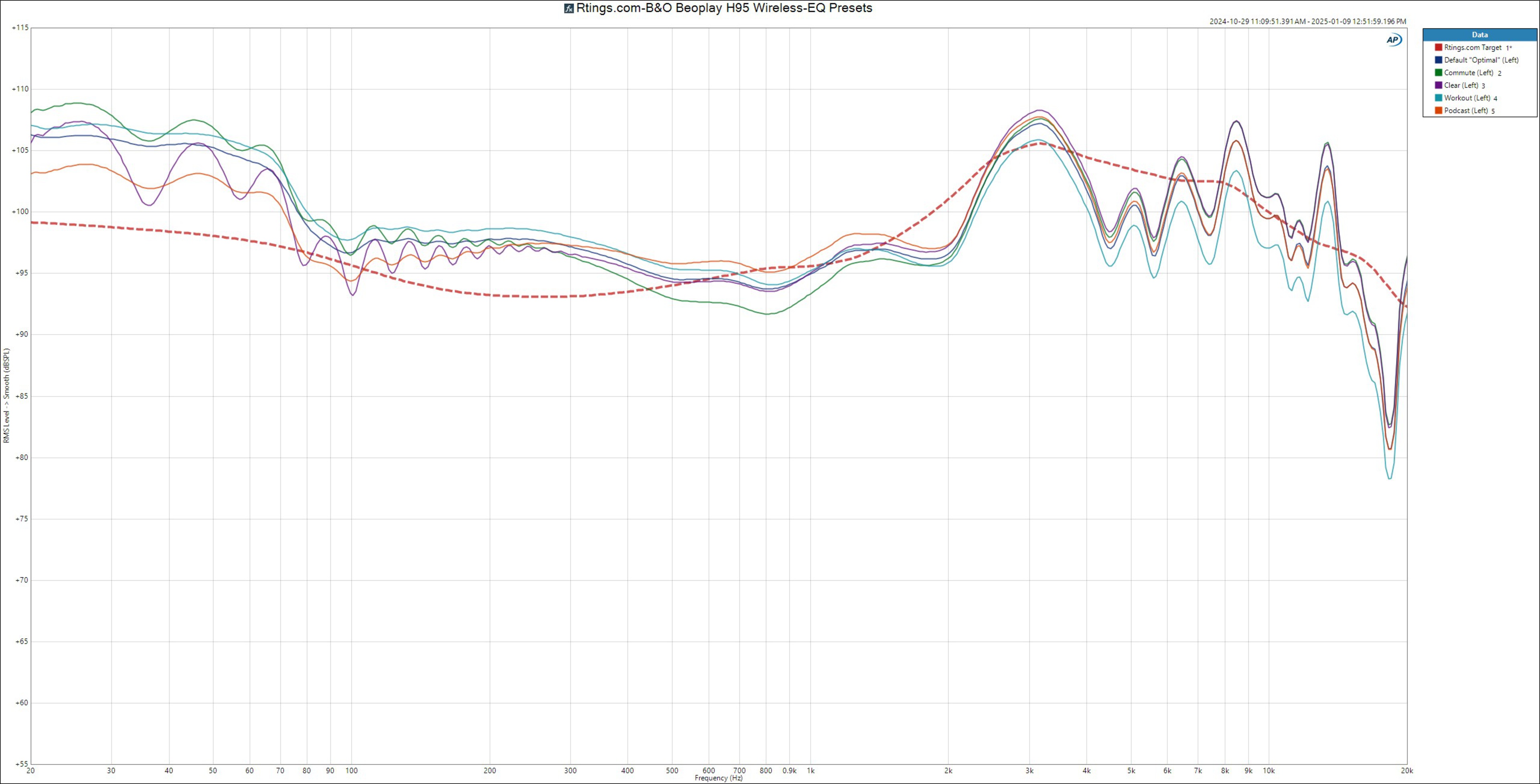 These are the settings we used to test the Bang & Olufsen Beoplay H95. Our results are only valid when using these settings. It is important to note that the 'Optimal' EQ preset we used for testing is no longer accessible once you change presets in the companion app. To get back to the 'Optimal' EQ preset, simply set all the sliders in the EQ to the middle position.