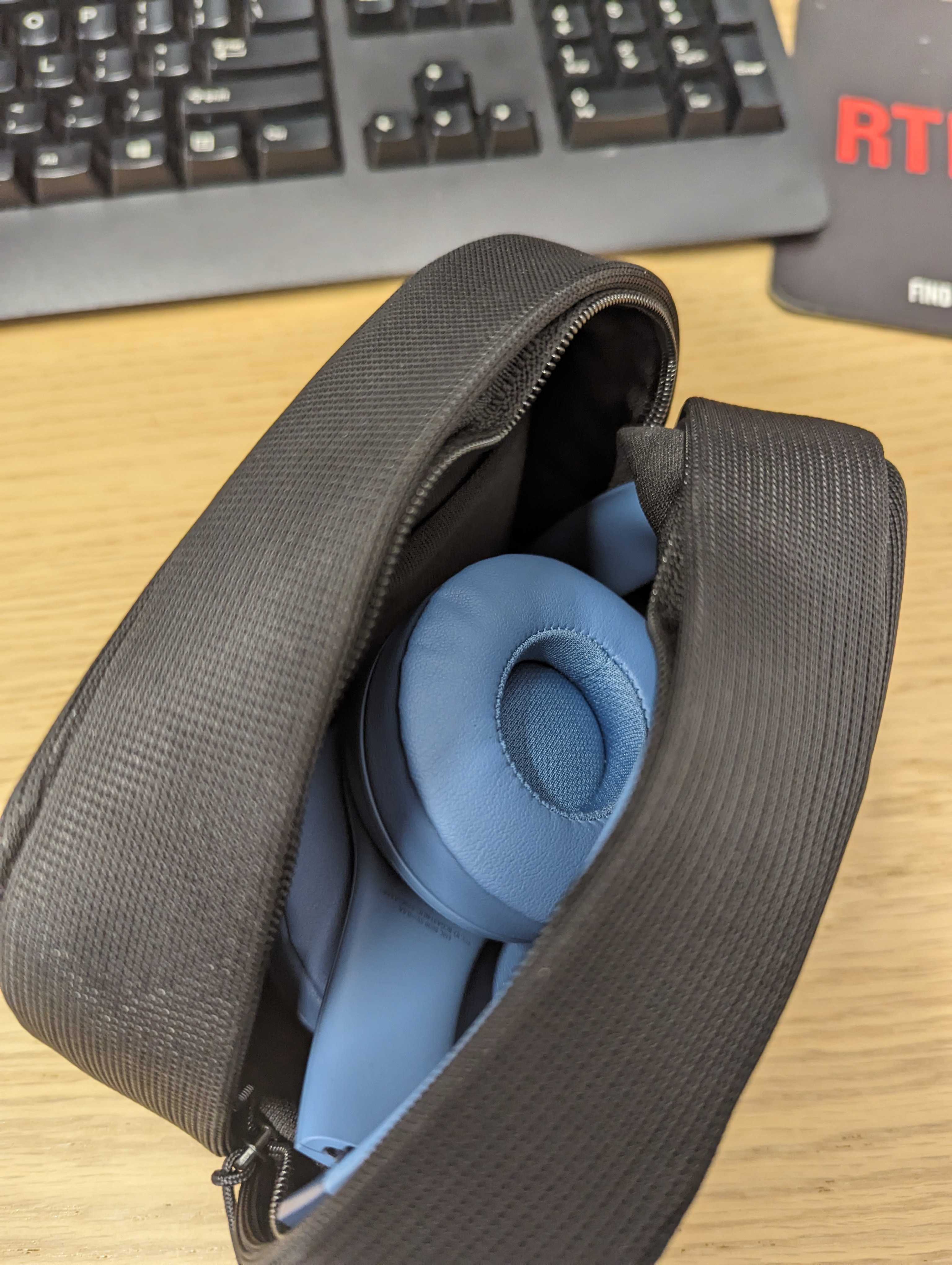 They come with a good carrying case made from a durable woven fabric, which feels thick and tough. There's a zipper to help keep the headphones safe inside. Inside the case is a soft lining material. There isn't any internal compartment to keep the cables separate from the headphones, though. You can see how these cans fit into their case here.