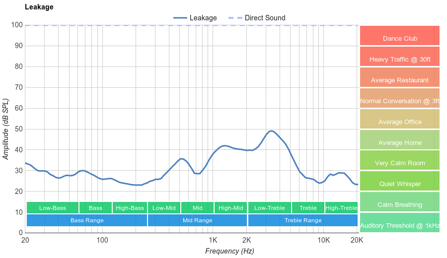 The leakage performance is great. Most leakage is found in the high-mid to mid-treble range, which sounds thin. In a noisy environment, people won't hear your audio if you have it cranked to a high volume.