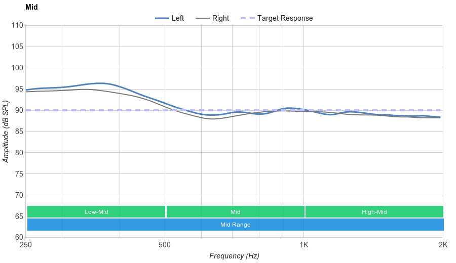 These cans have very good mid accuracy. The low-mid is pretty overemphasized, which muddies and clutters the mix. However, the rest of the range is well-balanced. The mid-mid is fairly neutral, so vocals and lead instruments are present, but a small dip in the high-mid slightly weakens their detail and clarity.