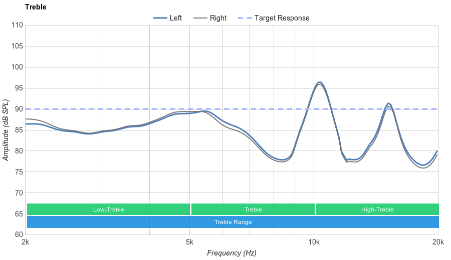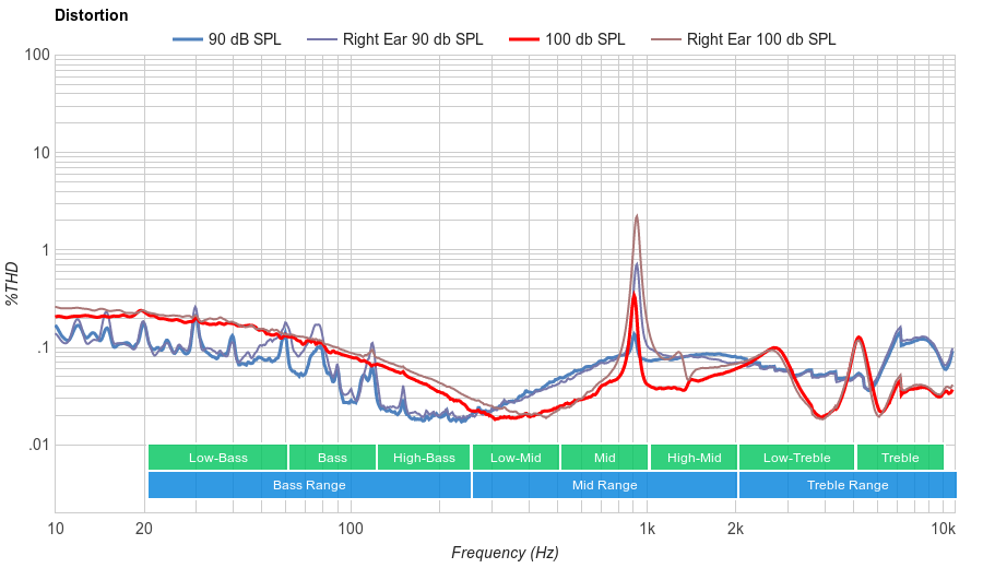 Poor Treble Range performance. The overall performance is underemphasized consistently by about 5dB. Considering the excess bass that these in-ears produce, the lack of high frequency emphasis makes these headphones exceptionally dark sounding.