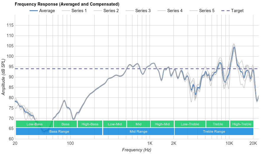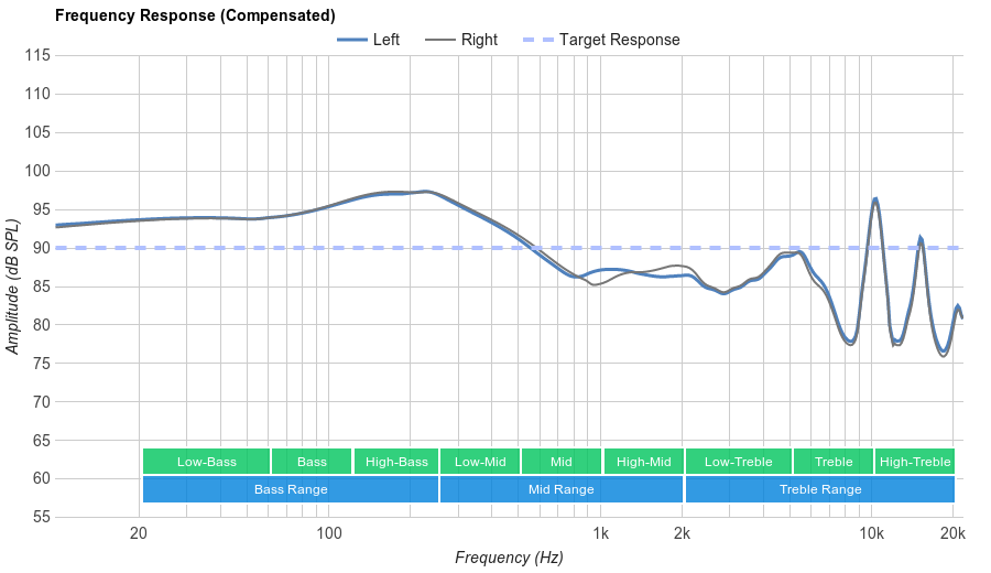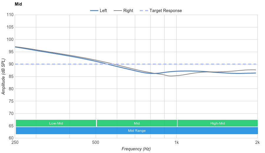 Poor Bass Range performance. The response is quite flat, but consistently overemphasized by more than 7dB. This makes the sound excessively bass heavy and muddy.