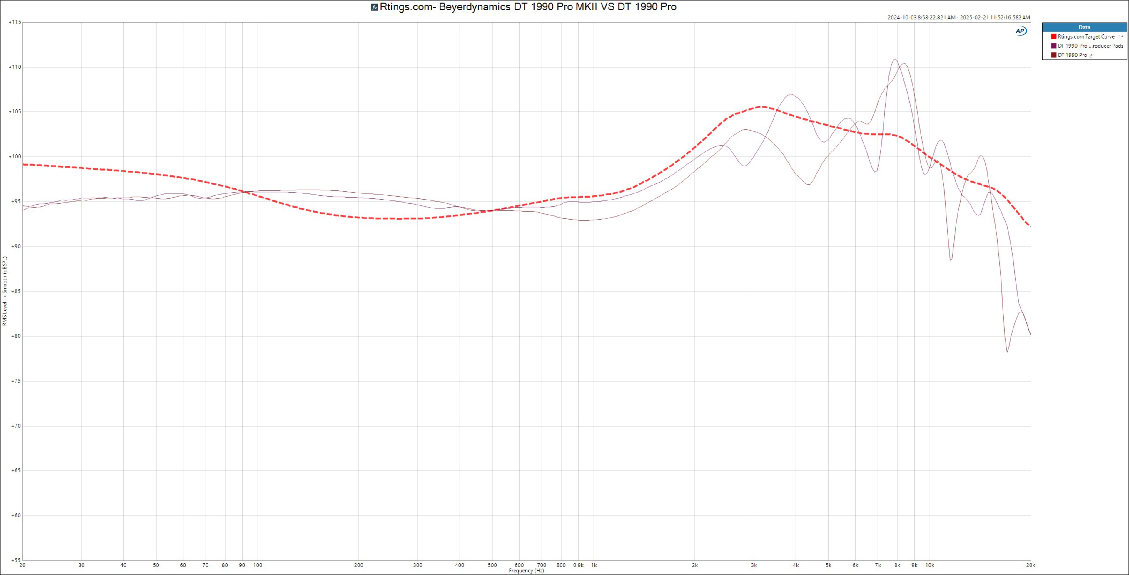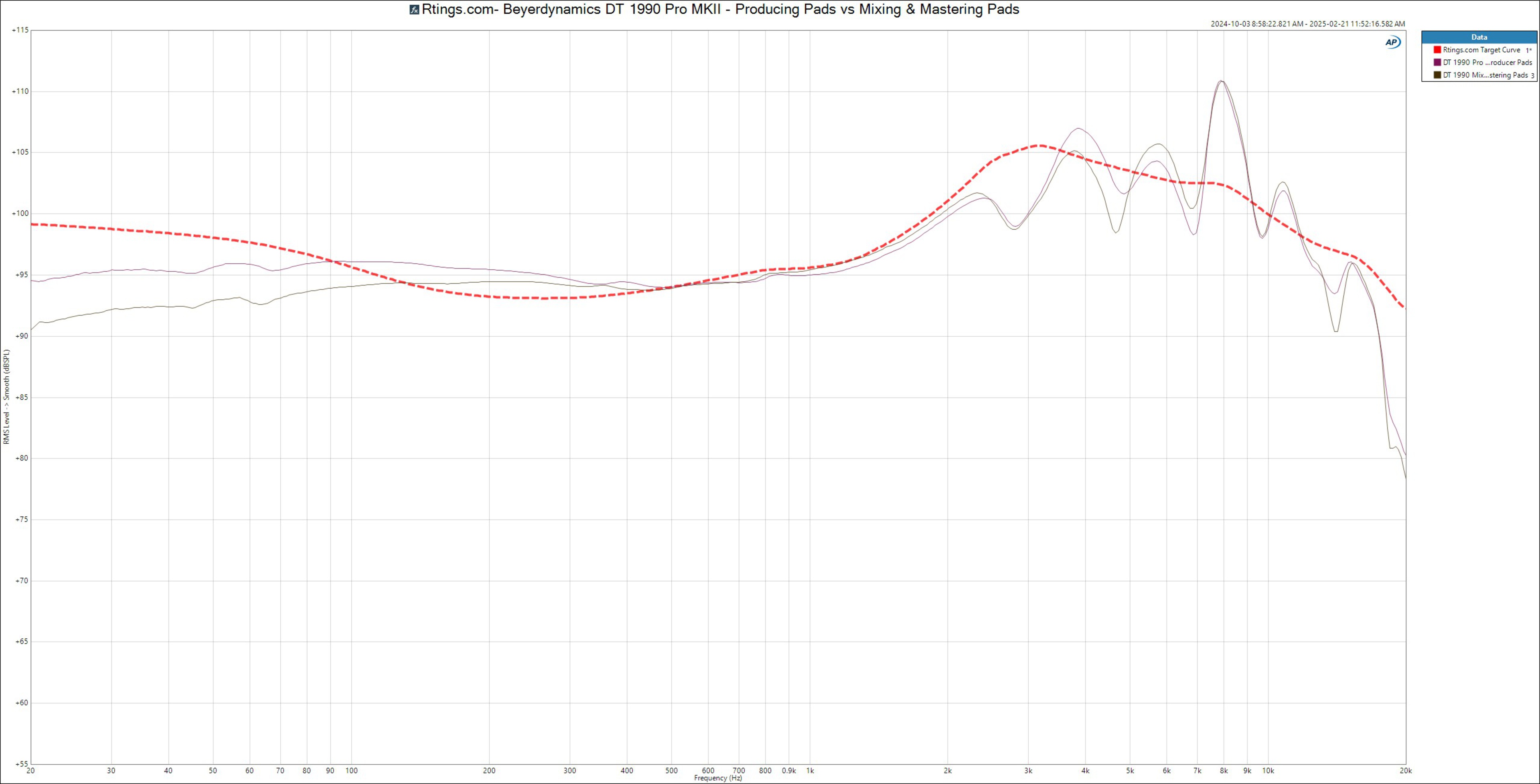 These headphones also come with a second set of ear pads meant for mixing; they produce a flatter profile that underemphasizes the frequency response of the bass to low-mids. Compared to the original Beyerdynamic DT 1990 PRO, the MKII sound quite similar. With both using their respective producing pads, the most notable differences are in the treble range. The original DT 1990 PRO have fewer but more noticeable dips relative to our target curve: in the low-treble, vocals and instruments may lack some detail compared to the MKII.