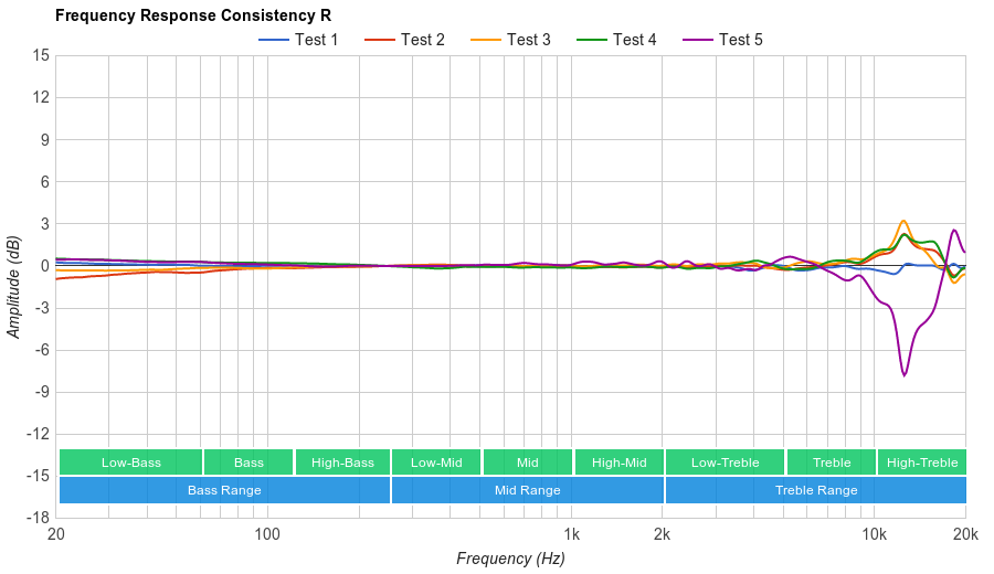 Excellent consistency. The semi-open enclosures of the DT-880 mean they don't rely heavily on an air-tight seal to create their Bass. Therefore, they tend to perform quite consistently, even though the Bass Range of our Over-Ear and On-Ear headphones are measured on 5 different human subjects, 5 times each.