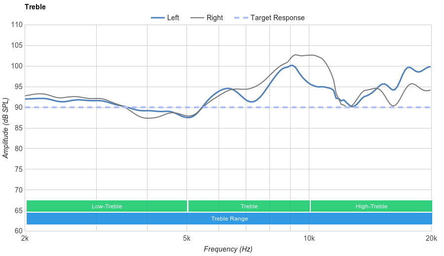 Decent Treble Range performance. Low-treble is well-balanced, but treble is over-emphasized by an average of 5dB, peaking at 12dB around 9KHz. This makes the sound of the Treble on these headphones noticeably bright, and they could sound a bit harsh on overly bright tracks.