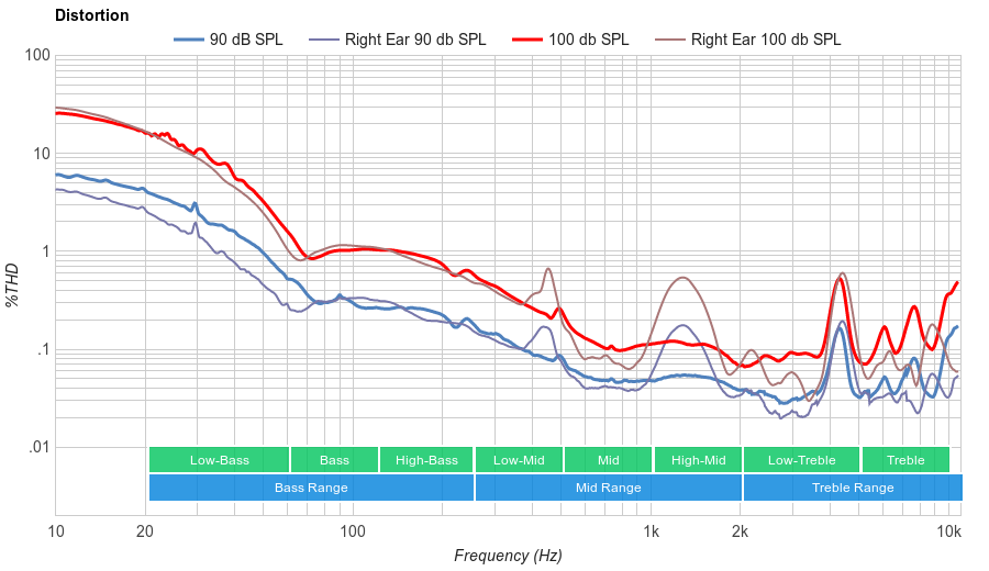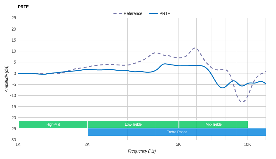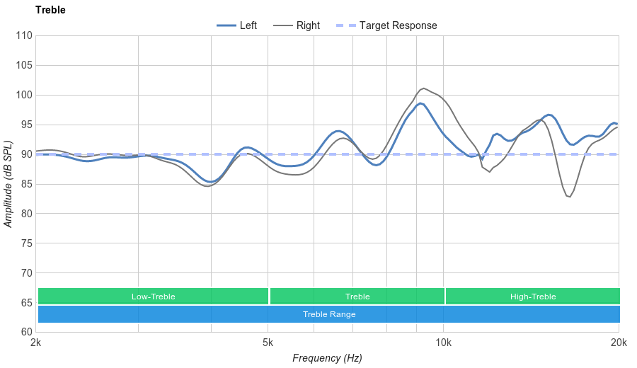 Their compliance with our treble target is superb. The lower part of this range is well-balanced and renders the upper harmonics of vocals in a detailed, transparent way. There's some over-emphasis in the middle of the range though, that adds some zing to percussion and cymbals.