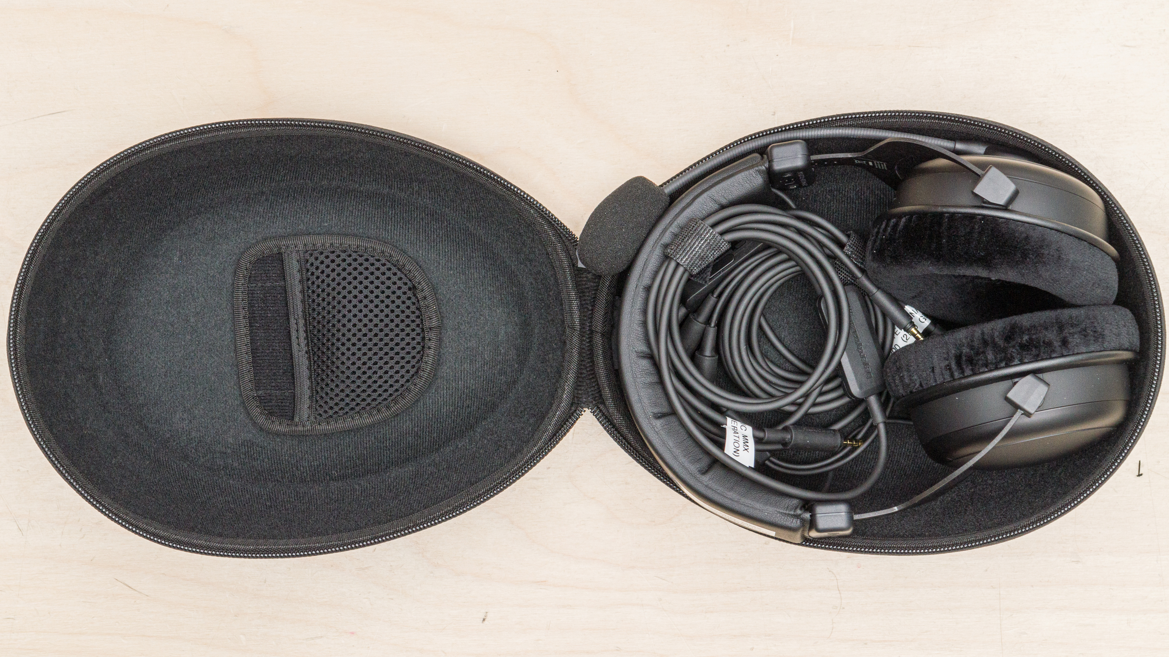 They have a great case. It's a rather large semi-hardshell with a molded interior to accommodate the headphones, and it zips open with a good amount of padding. A small pocket, affixed with a hook-and-loop backing, can hold one spare cable. Although the pocket is small, you can move it around the interior of the case, which is interesting but not especially helpful. You can see in the interior view that it's about as small as the manufacturer can make the case considering the dimensions of the headphones. It'll offer protection from drops and bumps, but the fabric-covered exterior won't fully ward off water spills.