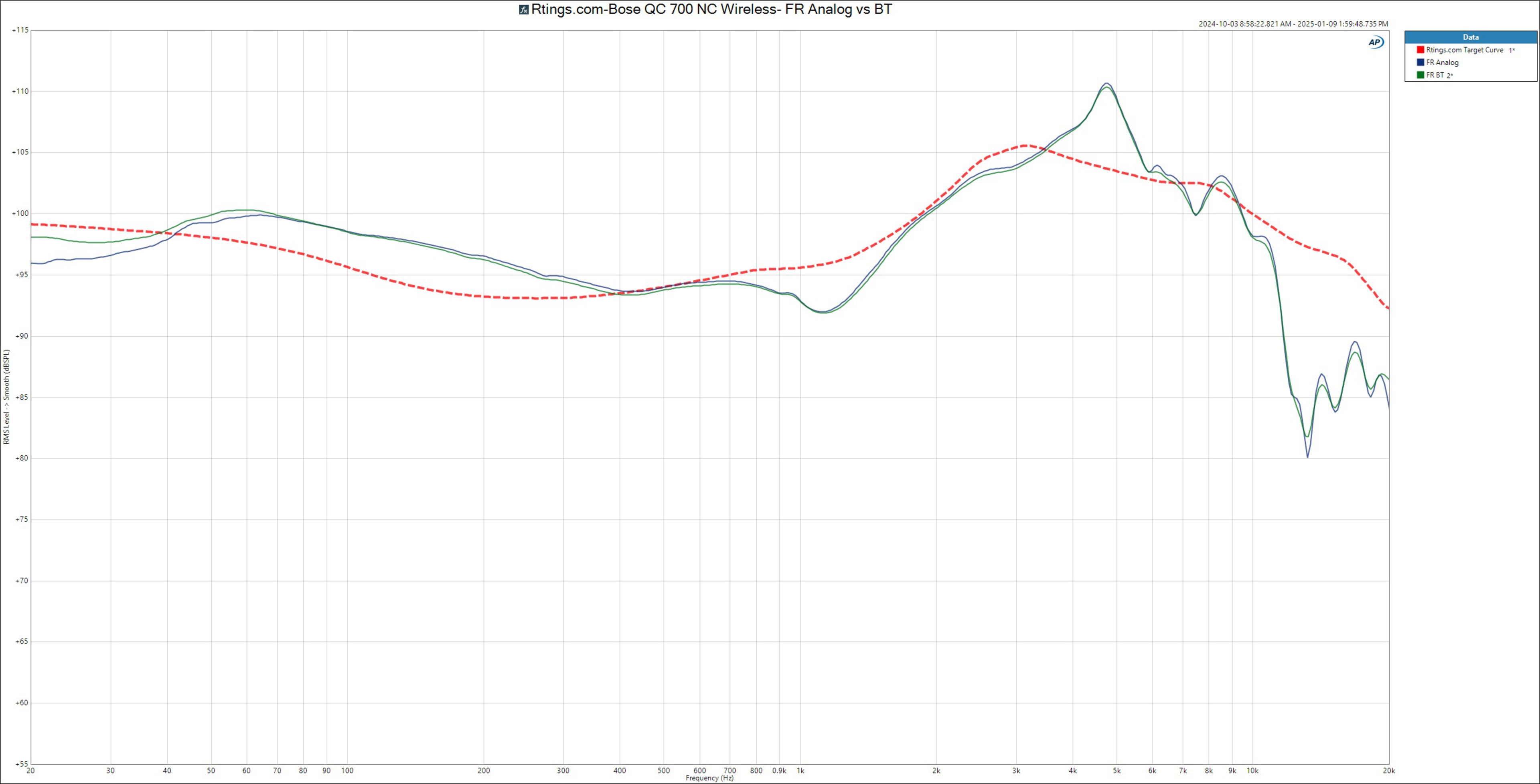 The Bose Noise Cancelling Headphones 700 have excellent compliance with our target. The rumble of low bass is reproduced mostly accurately. There's some overemphasis in the mid to high-bass, so in songs like Seven Nation Army by The White Stripes, the well-known bassline at the beginning of the track has a bit of extra punch and body.
