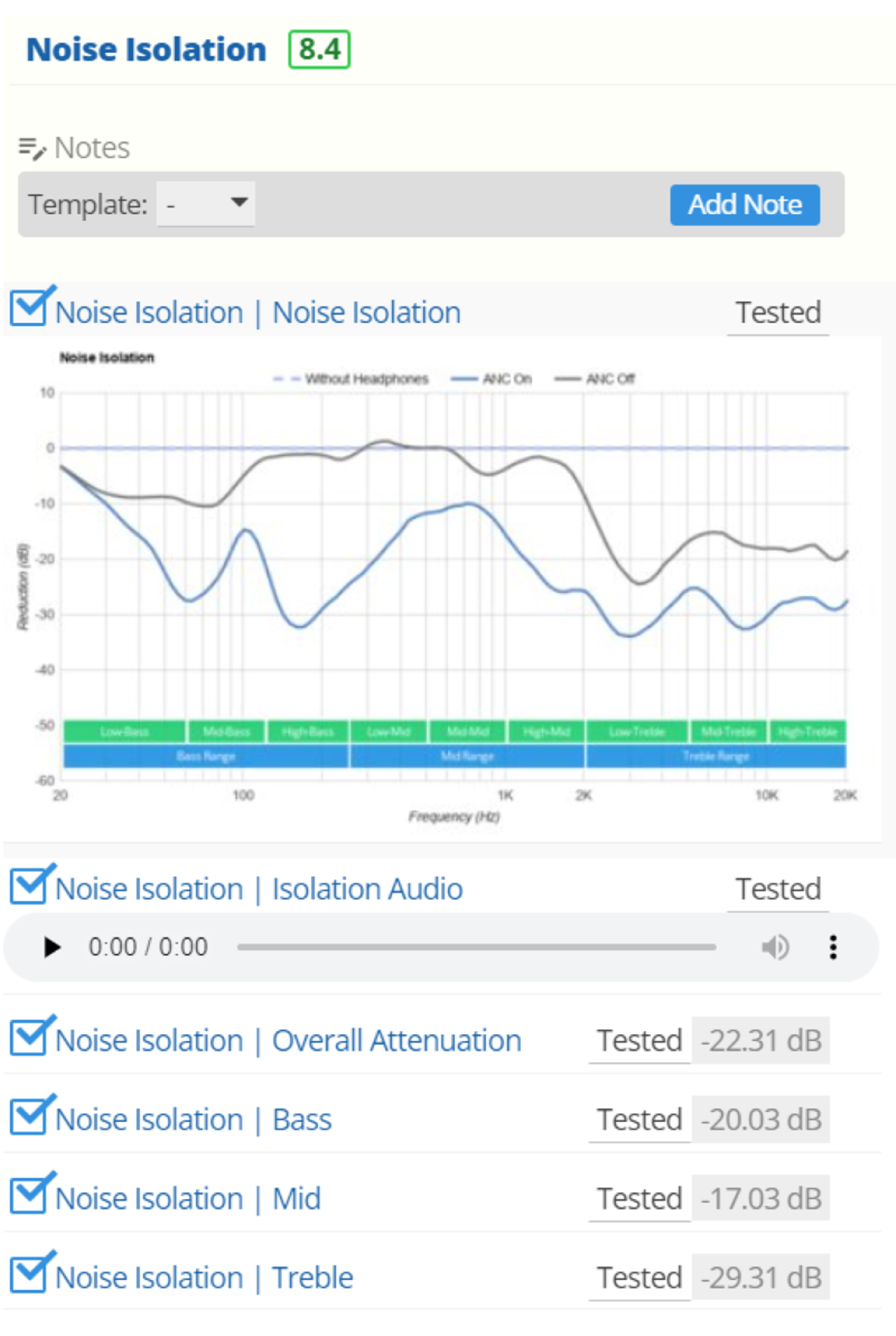 These headphones have great noise isolation. Using firmware version 2.0.7-18347+fb87694 and their strongest ANC setting, they do a very good job cutting down bass-range noise like the rumble of bus and plane engines. They can also block out an impressive amount of mid-range sound, like ambient chatter, and high-pitched noise, like the hum of an AC unit. You can see the originally published results using version 1.0.7-9846+620b71c here too. While the score didn't change between firmware updates, the results show that the ANC is slightly less effective at blocking out bass-range noise after the firmware update but more effective at isolating against mid-range noise.