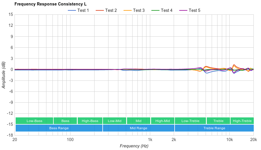 The frequency response consistency of the Bose SoundSport Wireless is very good across multiple users and re-seats, ensuring consistent delivery of bass and treble. Provided you achieve a good fit and seal with the included tips, you should experience the same sound every time you use these headphones.