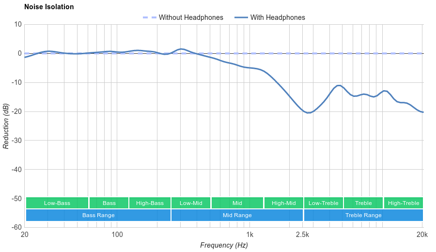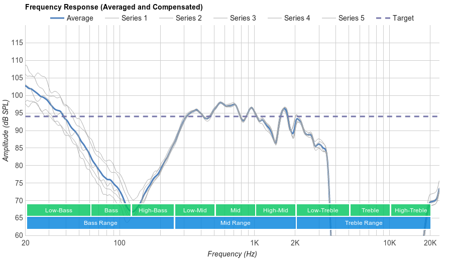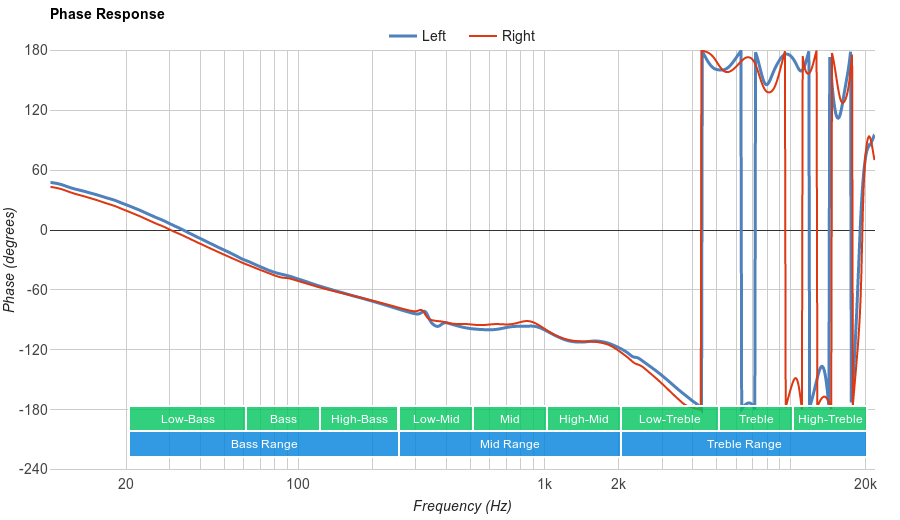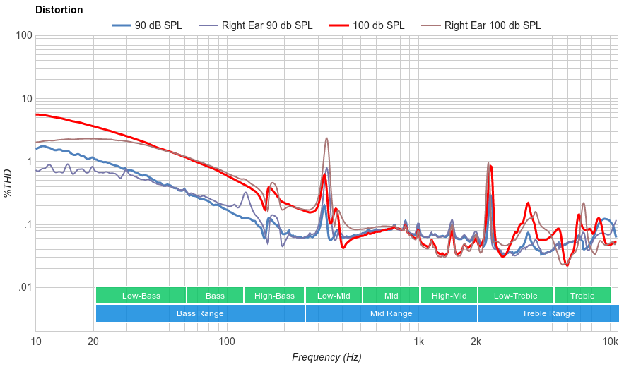 The peaks and dips performance of these headphones is very good. Almost the entire range is fairly flat, with only a few sharp peaks in the treble range which may cause some sounds to come across as slightly piercing or harsh, though it likely shouldn't be too noticeable for most people.