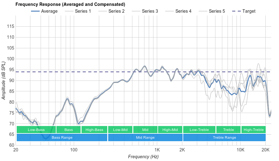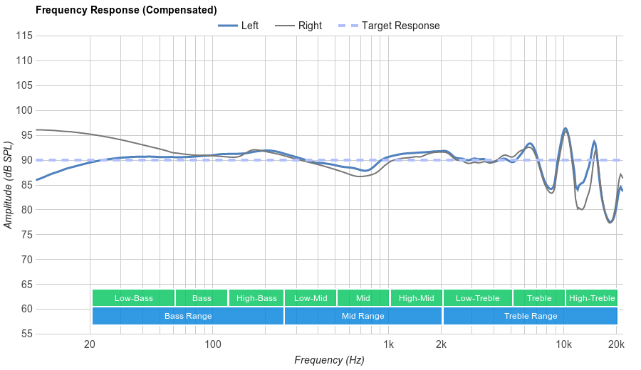 The Bose SoundTrue Ultra has a great mid-range. Low-mid and high-mid are flat and within 1dB of our neutral target, which is great. This ensures a well-balanced and clear vocal reproduction. The wide 3dB dip in mid-mid nudges vocals and lead instruments towards the back of the mix by giving more emphasis to bass and treble ranges, but this effect will be quite subtle.