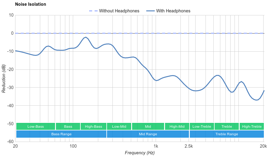 The isolation performance of the Bose SoundTrue Ultra is about average. Although these earbuds don't have ANC (active noise cancellation) and isolate passively, they achieved more than 8dB of isolation in the bass range. This is about average for reducing the rumble of airplane and bus engines. In the mid-range, important for blocking out speech, they isolate by 14dB, which is quite decent. In the treble range, occupied by sharp sounds like S and Ts, they achieved an isolation of 20dB, which is above-average.