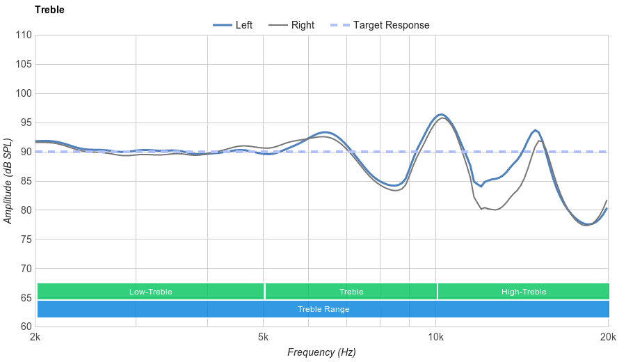 The Bose SoundTrue Ultra have a very good treble performance. Low-treble is flat and within 0.3dB of our neutral target. Mid-treble, is a bit uneven, especially in the sibilance range (6KHz-10KHz), which could make the S and T sounds a bit inconsistent.