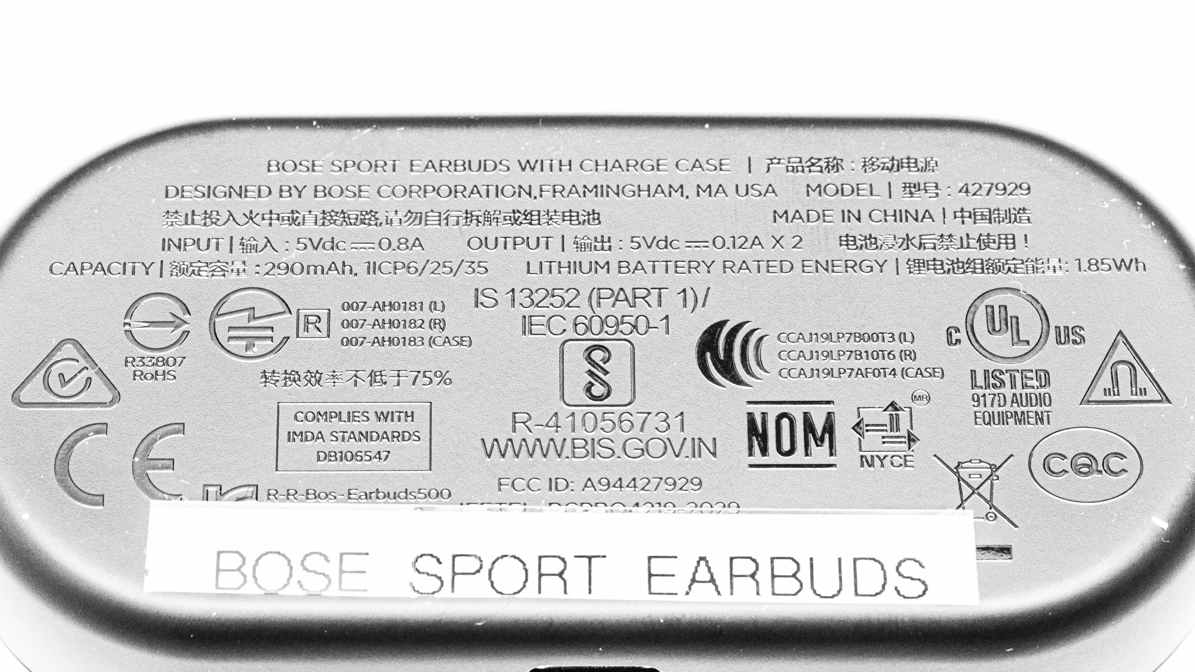 The Bose Sport Earbuds come in three color variants: 'Triple Black', 'Baltic Blue', and 'Glacier White'. We tested the 'Triple Black' variant, and you can see the label for the model we tested here. We expect the other color variants to perform similarly.