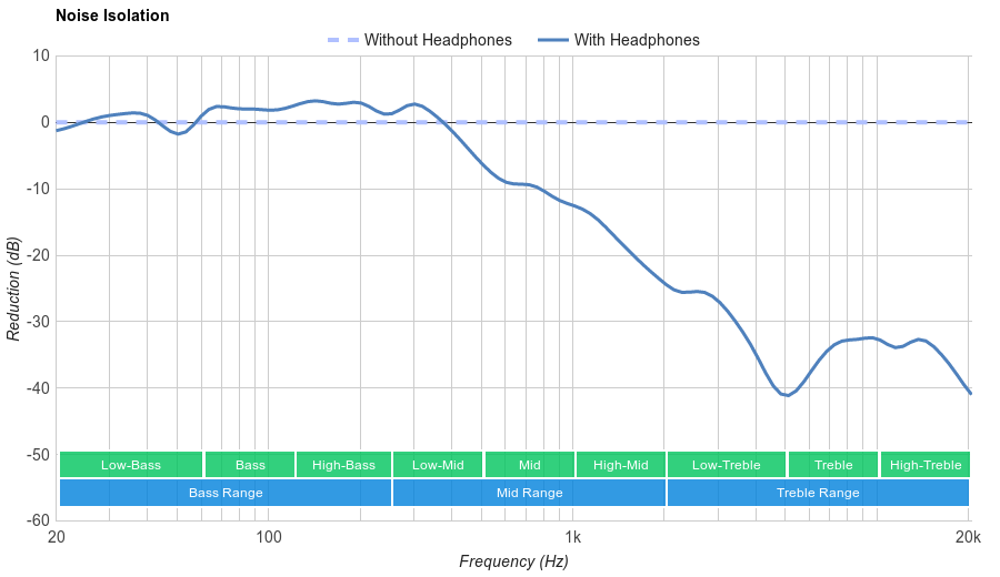 Poor overall isolation. Since these headphones don't have active noise cancelling, the passive isolation provided in the Treble Range by the ear cups is quite good. But it only becomes effective past 400HZ and does not really block any low/bass frequencies. Isolation in the mid-range is also below average.