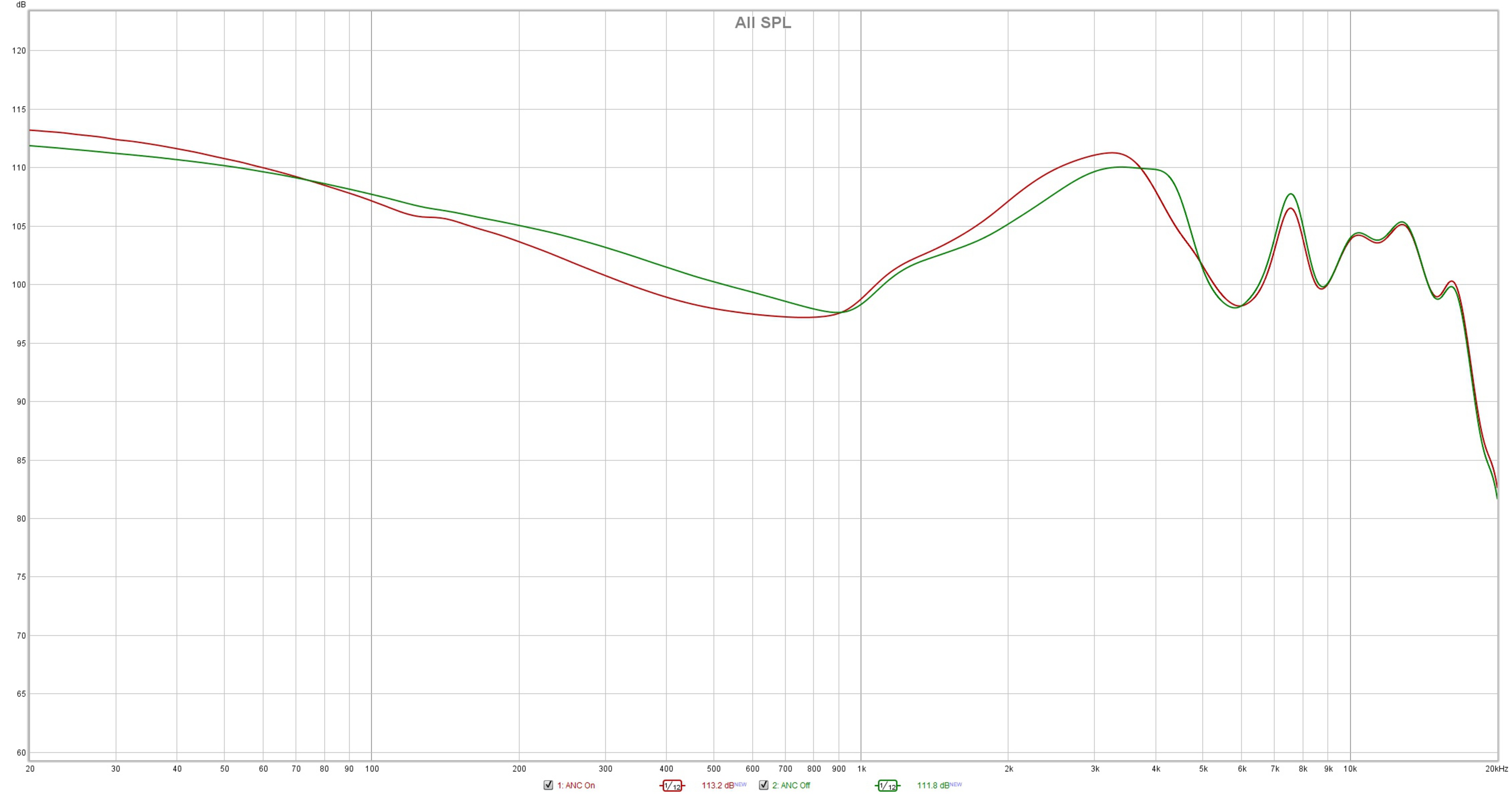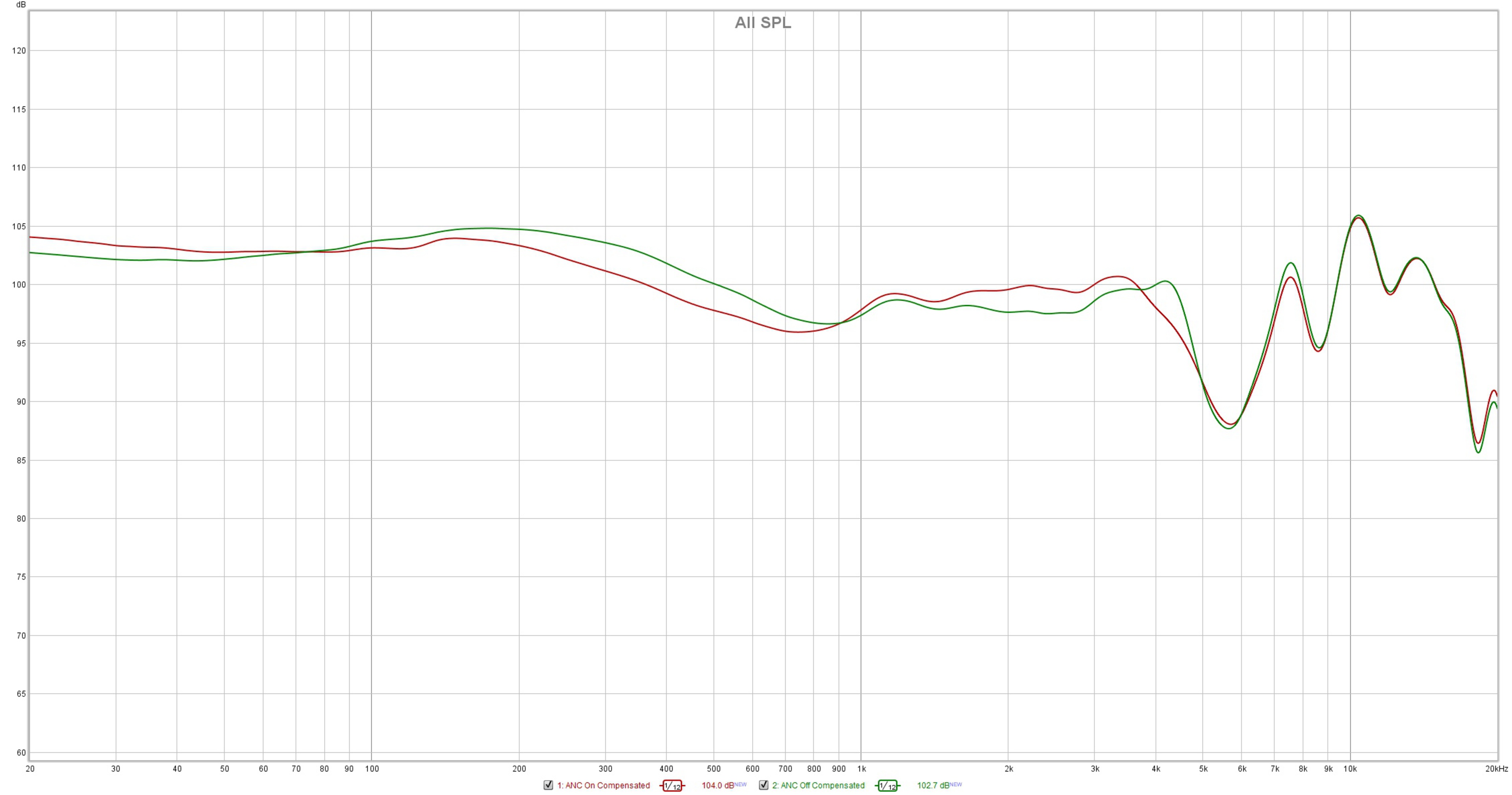 We also compared their sound profile when the ANC is on versus off. Here are the raw and compensated frequency response graphs. The results in our review reflect the ANC on, but if you turn the ANC off, you'll experience a little less thump and rumble in mixes but more boom and muddiness. Vocals and instruments are also a bit less clear and detailed.