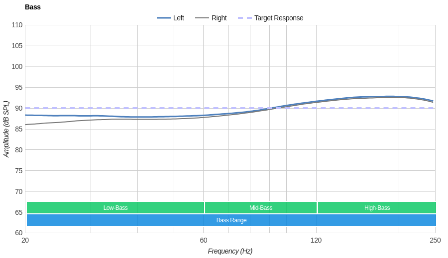 The BRAINWAVZ HM5's bass accuracy is great. LFE (low-frequency extension) is 10Hz, which is excellent. Low-bass, responsible for the thump and rumble common to bass-heavy genres, is lacking by 2dB, which is subtle. Mid-bass, responsible for the body of bass guitars and punch of kick drums, is within 0.4dB of our neutral target. High-bass, however, is overemphasized by about 2dB, which adds a bit of muddiness to bass.