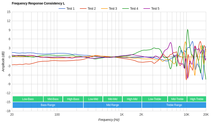 The BRAINWAVZ HM5 have a below-average frequency response consistency. In the bass range, the maximum deviation across our five human subjects is about 4dB, but happening across a wide region, which makes it more noticeable. We also noticed that the biggest deviation was measured on the subject wearing glasses. The maximum deviation in the treble range is about 5dB around 3kHz, which is significant, suggesting that their treble delivery is sensitive to placement and positioning.
