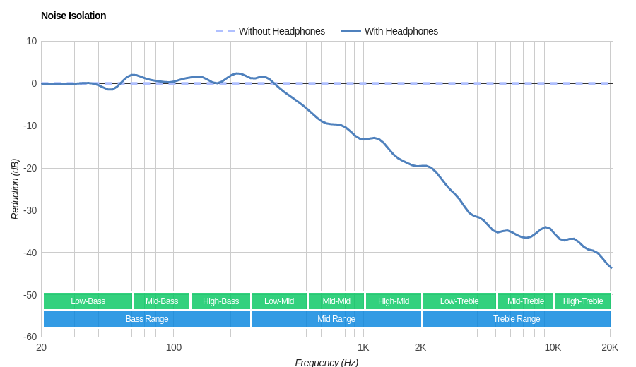 The BRAINWAVZ HM5's isolation performance is sub-par. These over-ear headphones don't have ANC (active noise cancellation) and isolate passively. Therefore, they don't achieve any isolation in the bass range. This means they will let in all the rumble of airplane and bus engines. In mid-range, important for blocking out speech, they achieve 9dB of isolation, which is about average. In the treble range, occupied by sharp sounds like S and Ts, they isolate by more than 33dB, which is good.