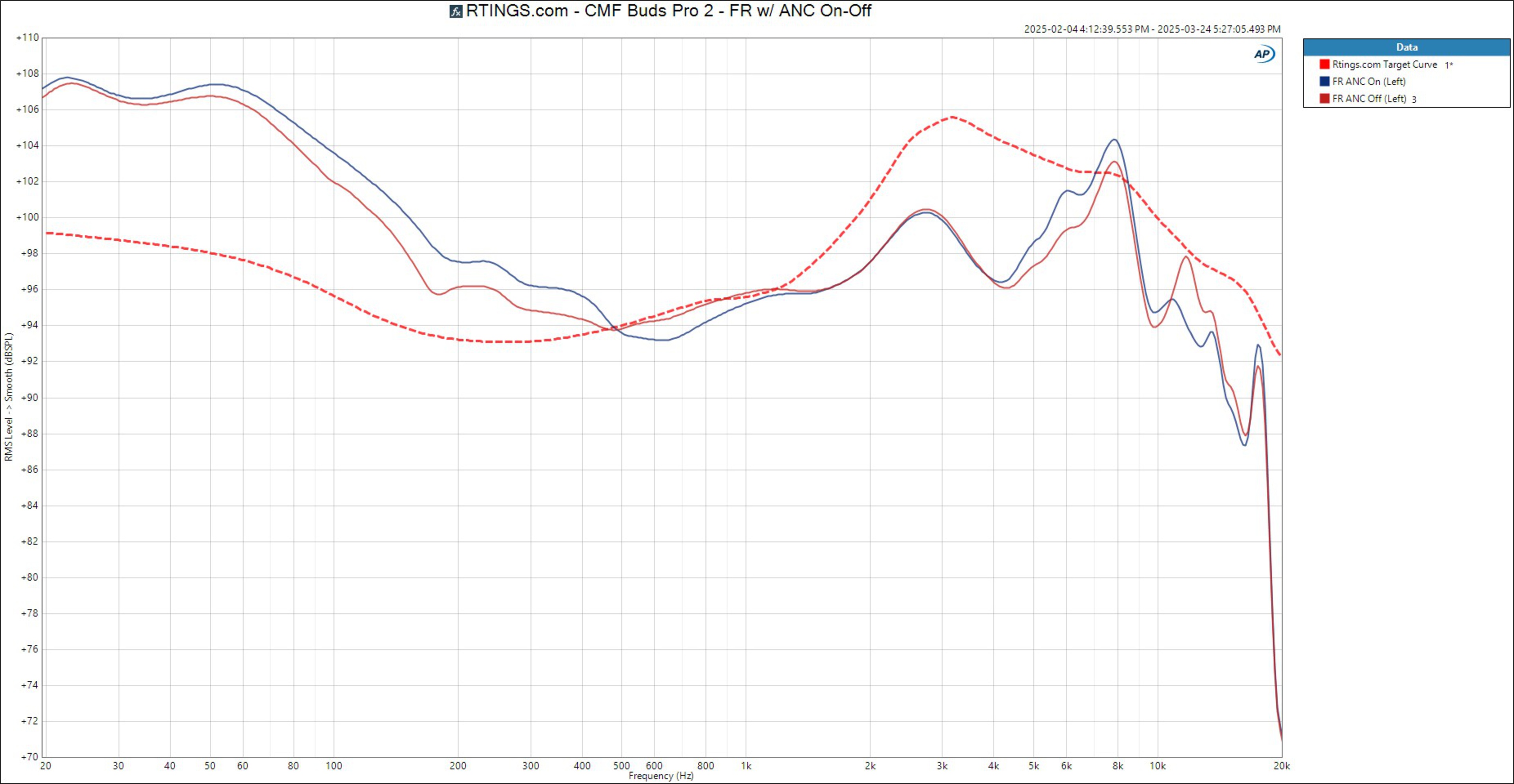 The CMF Buds Pro 2 have great peaks and dips performance. There are small wobbles, which are subtle through the bass and mid-range, producing a smooth sound. The low-treble has a small peak that is a little harsh, followed by a dip that slightly dulls vocals. A peak in the mid-treble causes cymbals to jump out in the mix as somewhat piercing, while the dips and peaks in the upper treble can depend on your hearing sensitivity.
