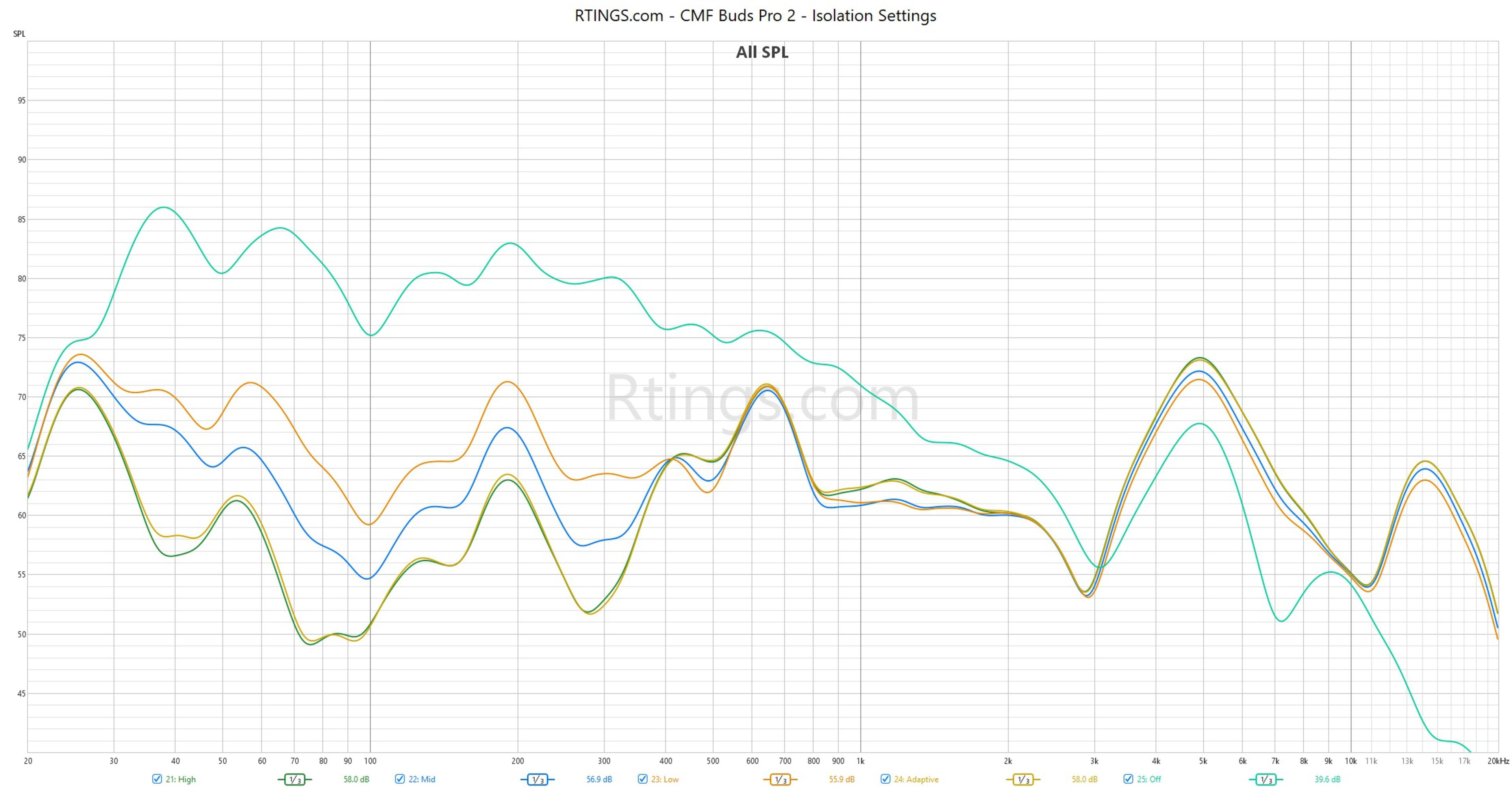 The CMF Buds Pro 2 have very good noise isolation. With the ANC set to 'High,' they cut out low-pitched noise well, as well as mid-range sounds like office chit-chat. You can also choose 'Adaptive' mode, which seems to perform similarly to 'High,' or choose a lower strength for less environmental isolation, as shown for comparison. While the buds have a fit test in the app to help you find the best ear tip size, the buds don't passively block shrill noises super consistently. That means some high-pitched noises can stick out more than others, depending on the frequency.