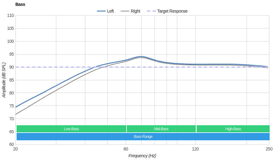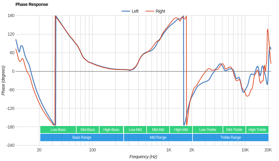 The Cowin E7 Pro's imaging performance is excellent. Weighted group delay is at 0.61, which is decent. Also, the GD graph shows that the group delay response crosses the audibility threshold below 80Hz, but not by much. This may result in a loose and slow bass response, but it won't be very audible since the E7 Pro doesn't produce much bass below 40Hz. Additionally, the L/R drivers of our unit were exceptionally well-matched, which is important for the accurate placement and localization of objects (voices, instruments, video game effects) in the stereo field.