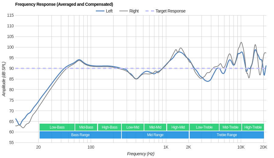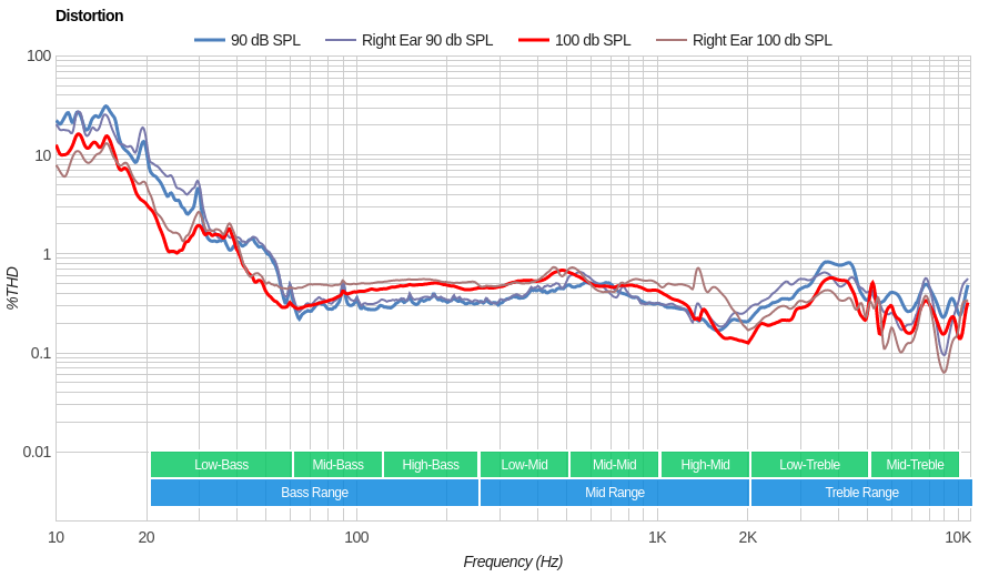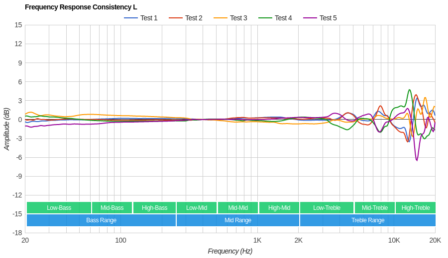 The Cowin E7 Pro have great frequency response consistency. In the bass range, the maximum deviation across our five human subjects is less than 2dB, which is great. They also have a very consistent delivery in the treble range, and the response doesn't change much across multiple re-seats and positions.