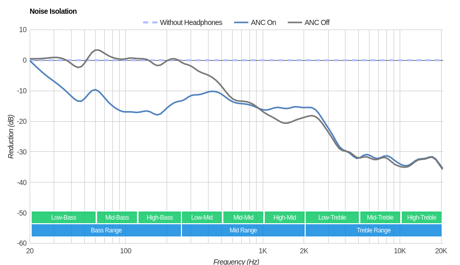 The Cowin E7 Pro have decent isolation (see our recommendations for the best cancelling headphones). In the bass range, where the rumble of airplane and bus engines sits, they isolate by about 12dB, which is decent. In the mid-range, important for blocking out speech, they achieved about 14dB of isolation, which is also good. In the treble range, occupied by sharp sounds like S and Ts, they reduce outside noise by about 29dB, which is also great.