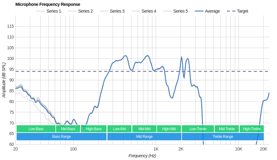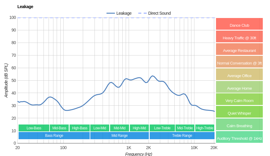 The leakage performance is decent. A significant portion of the leakage is between 500Hz and 2kHz, which is a relatively broad range. It results in a leakage that is fuller sounding than that of in-ears and earbuds. However, the overall level of the leakage is not very loud. With the music at 100dB SPL, the leakage at 1 foot away averages at 39dB SPL and peaks at 54dB SPL, which is just above the noise floor of most offices.