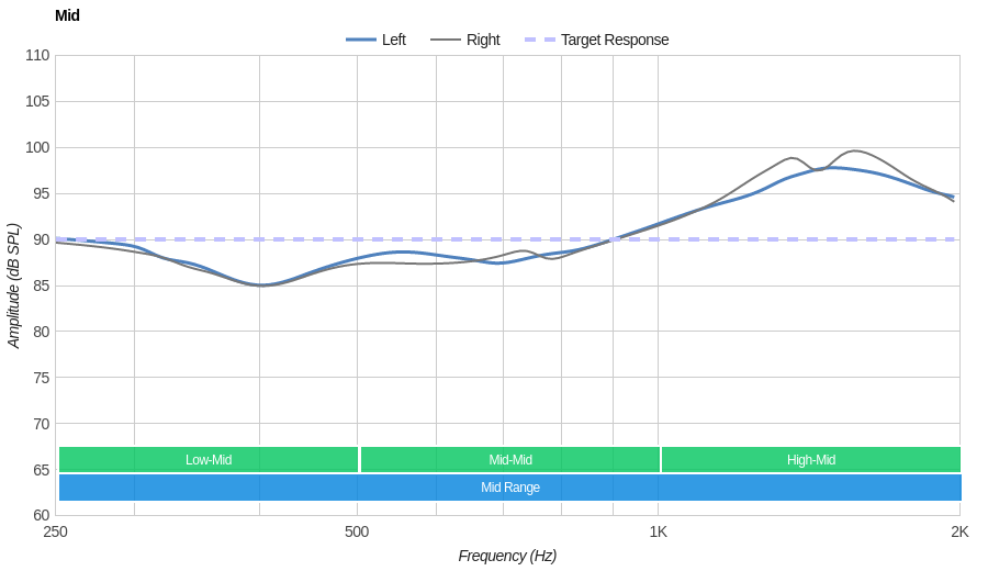 The mid-range performance is sub-par. The overall response is rather uneven and not very balanced. The low-mid is somewhat neutral, although there's still some overemphasis coming from the high-bass, which could make mixes sound slightly cluttered. The mid-mid and high-mid are also overemphasized, so vocals and lead instruments are boxy and honky.