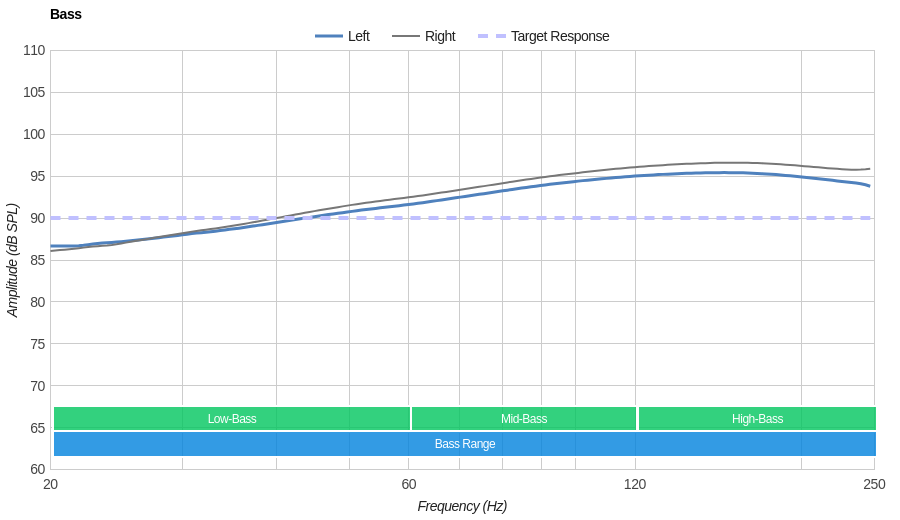 The Cowin E8 have an above-average bass. LFE (low-frequency extension) is at 13Hz, which is great. Low-bass, responsible for the thump and rumble common to bass-heavy music is under target but just 1dB. However, mid-bass, responsible for punch and body, and high-bass, responsible for warmth, are overemphasized by more than 4dB. This makes the overall bass of the Cowin a bit too heavy and muddy.