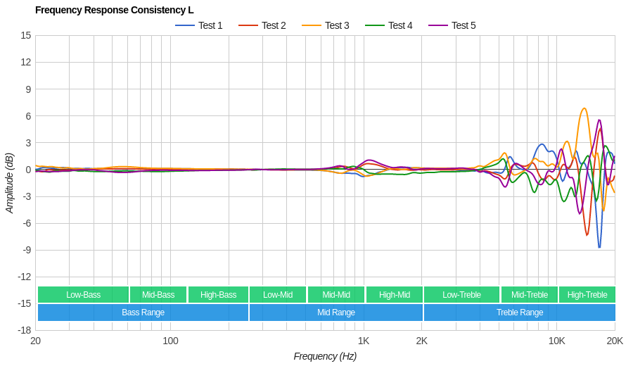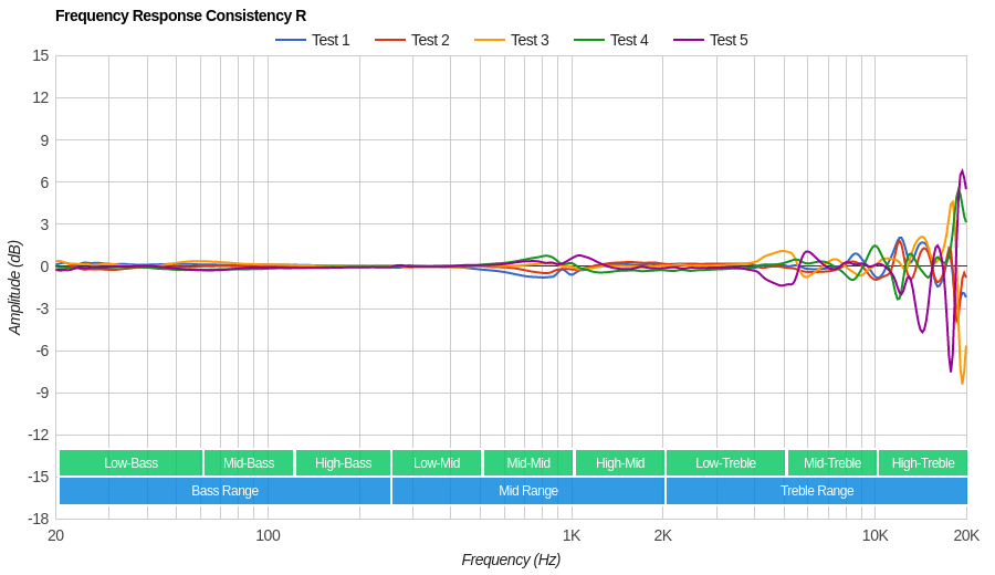 The Cowin E8 have very good frequency response consistency. In the bass range, the maximum deviation across our five human subjects is less than 1dB, which great. The also have a very consistent delivery in the treble range, below 10KHz, and the response doesn't change much across multiple re-seats and positions.