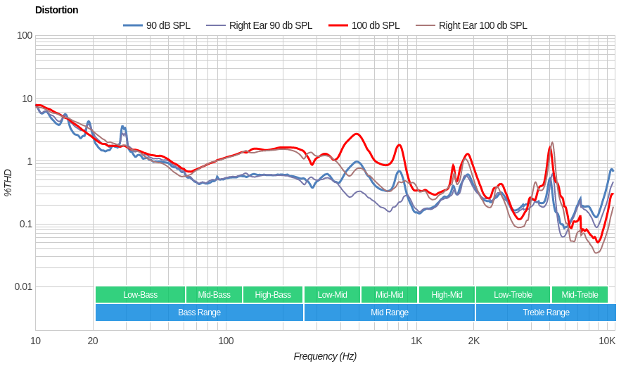 The leakage performance of the E8 is sub-par. The significant portion of their leakage is spread between 400Hz and 6KHz, which is a broad range, spanning both the mid and treble ranges. However, the overall level of the leakage is not too loud. With the music at 100dB SPL, the leakage at 1 foot away averages at 47dB SPL and peaks at 60dB SPL, which is a bit louder than the noise floor of an average offices.