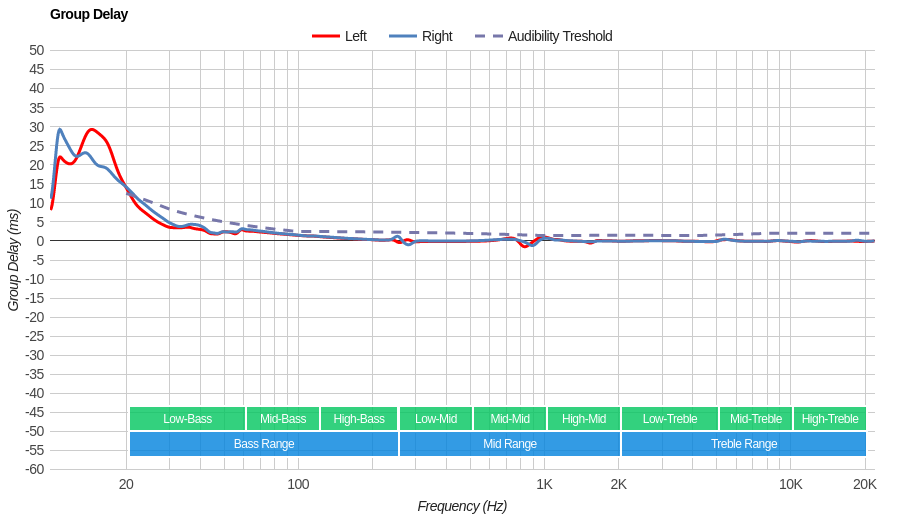 The imaging performance of the E8 is great. Weighted group delay is at 0.29, which is good. The GD graph also shows that almost the entire group delay response is within the audibility threshold. This results in a tight bass and a transparent treble reproduction. Additionally, the L/R drivers of our test unit were very well-matched in amplitude, frequency and phase response. This ensures an accurate placement and localization of objects (voices, instruments, video game effects) in the stereo field.