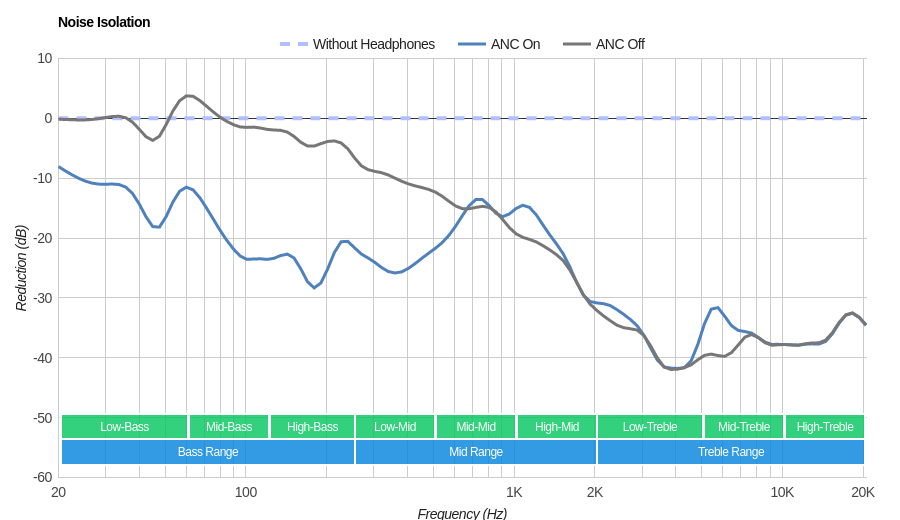 The Cowin E8 have a good isolation performance. With the ANC (active noise cancellation) enabled, they achieve more than 17dB of isolation in the bass range, which is quite good. This means they can cancel out the rumble of airplane and bus engines to a good degree. In the mid-range, important for blocking out speech, they isolate by more than 20dB, which is very good. In the treble range, occupied by sharp sounds like S and Ts, they isolate by 36dB, which is also good.