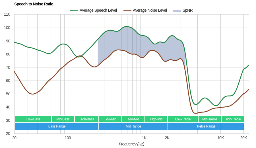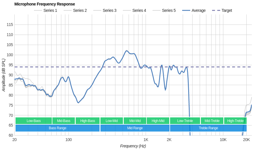 The recording quality of the microphone is mediocre. LFE (low-frequency extension) of 247Hz suggests that speech recorded/transmitted with this mic will sound relatively thin. The HFE (high-frequency extension) is at 3.5KHz, resulting in the speech to lack detail and sound a bit muffled. The response between the LFE and HFE points is rather uneven too, negatively affecting the intelligibility of speech.