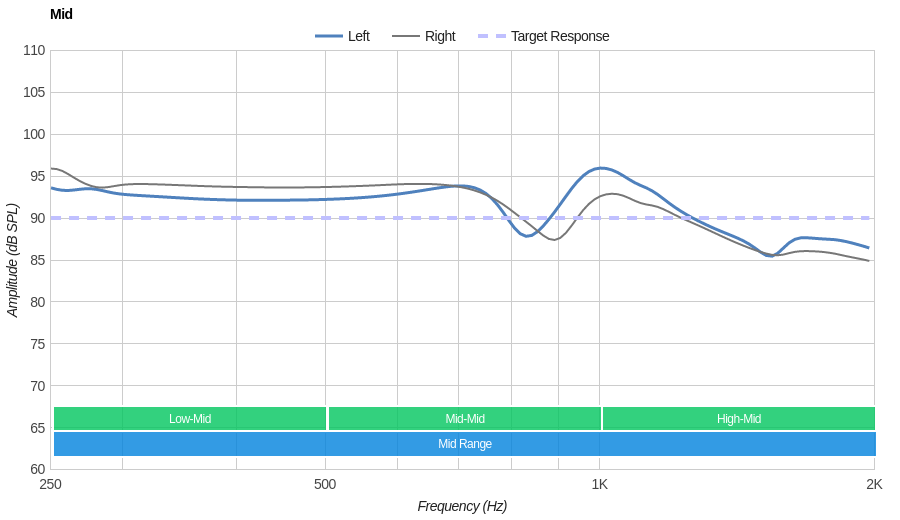 The mid-range is good. Low-mid is even and flat but overemphasized by more than 3dB. This thickens vocals a little bit and adds some clutter to the mix. Mid-mid is also over our neutral target by 2dB, which along with the hyped low-bass, makes the sound of the Cowin a bit mid-rangy.