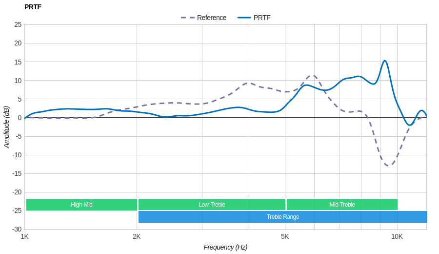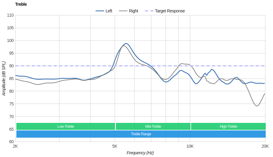 The Cowin E8 have a decent treble range performance. Low-treble is even, but consistently under our neutral target by 5dB. This has a negative effect on the detail and articulation of vocals and other lead instruments. The sharp peak at 5.5KHz makes certain frequencies in vocals, leads, and cymbals noticeably sharp and piercing.