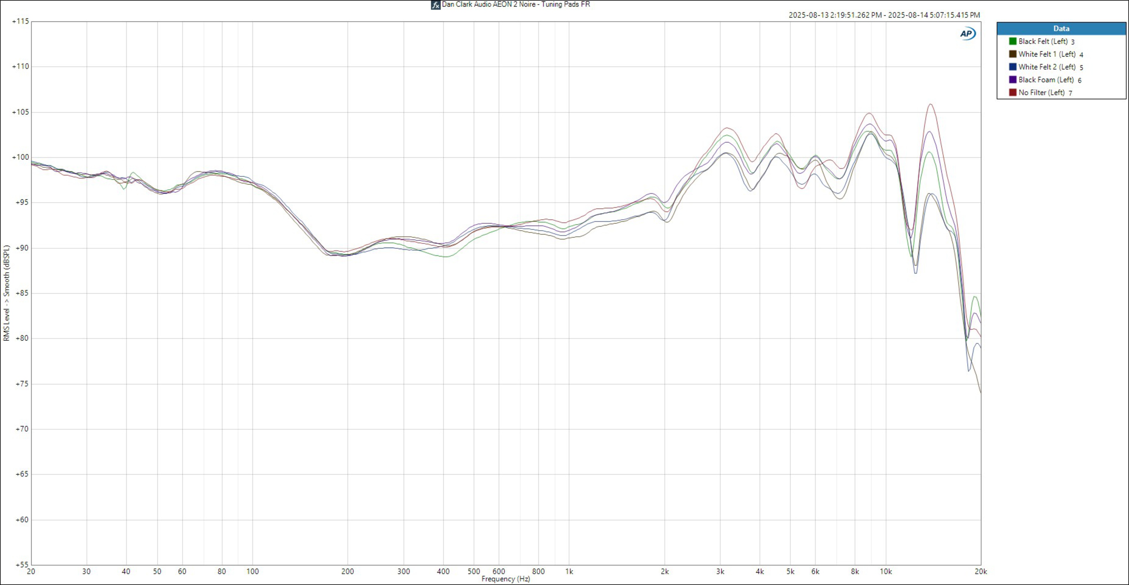 The Dan Clark Audio AEON 2 Noire have a balanced sound profile that's tuned to the Harman over-ear target (not to be confused with the Harman In-Ear Target within our multi-curve tool). It features a more emphasized mid-bass response compared to our target, with a pronounced peak at 10kHz. The headphones come with a variety of tuning pads that can be inserted into the earpads to slightly alter the sound, but we tested our unit without any tuning pads. It's worth bearing in mind that some of the treble-range differences between different pads can be attributed to differences in placement on our testing head, but certain pads do seem to change the tuning in the mid-range.