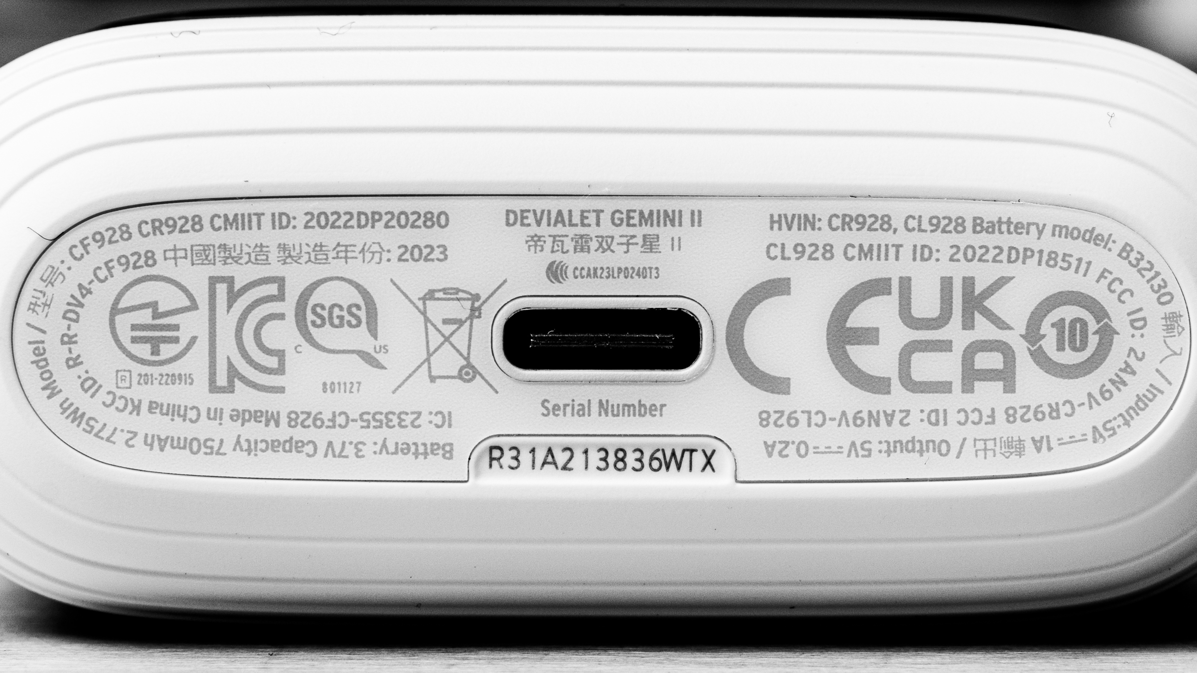 The Devialet Gemini II come in three color variants: 'Iconic White', 'Matte Black', and 'Gold'. We tested the 'Iconic White' variant, and you can see our model's label here. It's worth mentioning that there's a price difference between the 'Iconic White' and 'Matte Black' variants versus the 'Gold'. The 'Gold' model is more expensive as it's a collaboration with the Paris Opera and has a 24-karat gold finish on the carrying case as well as on the buds.